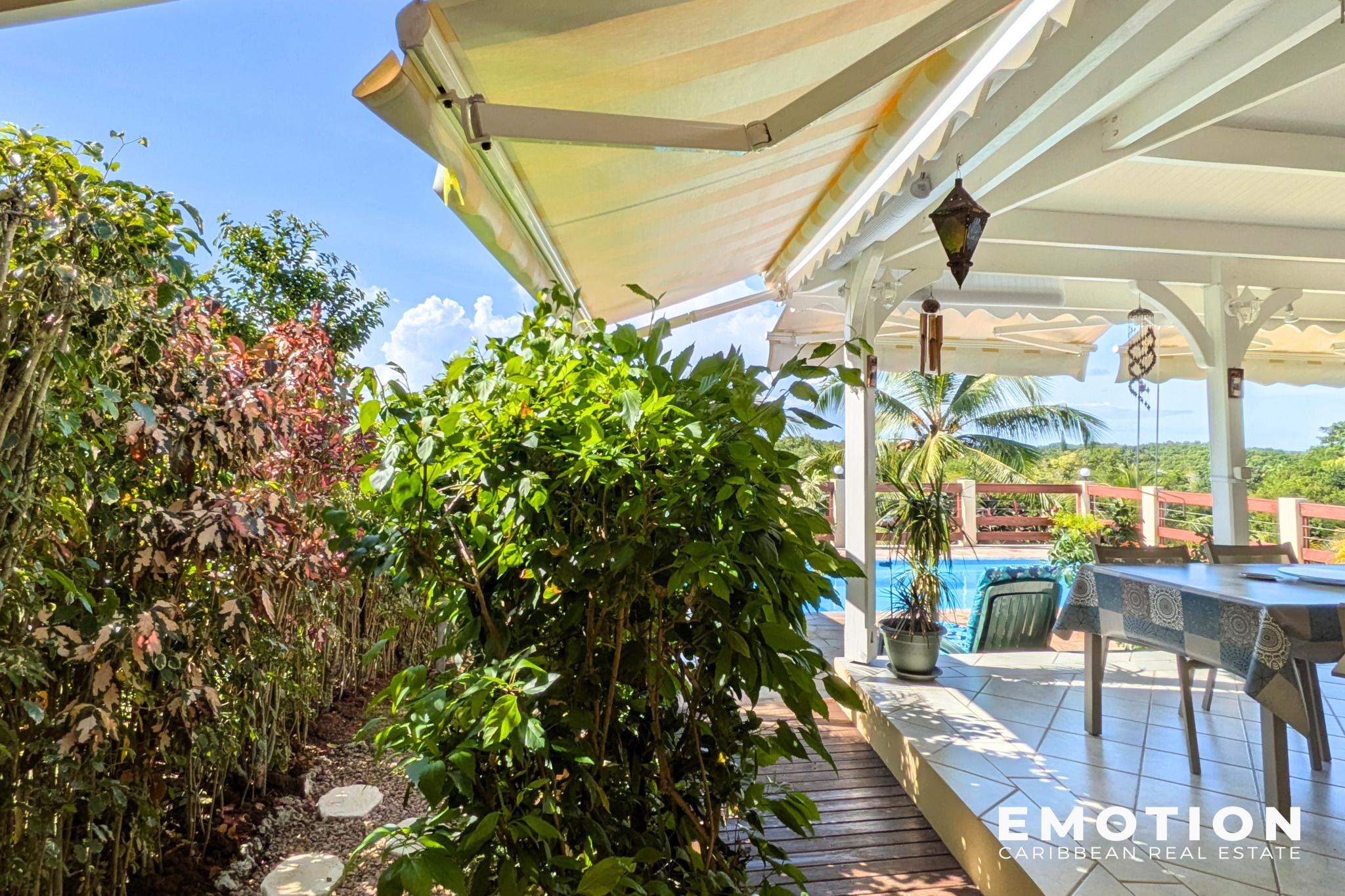 La terrasse est ombragée et ventilée pour profiter pleinement de déjeuner à proximité de la piscine.