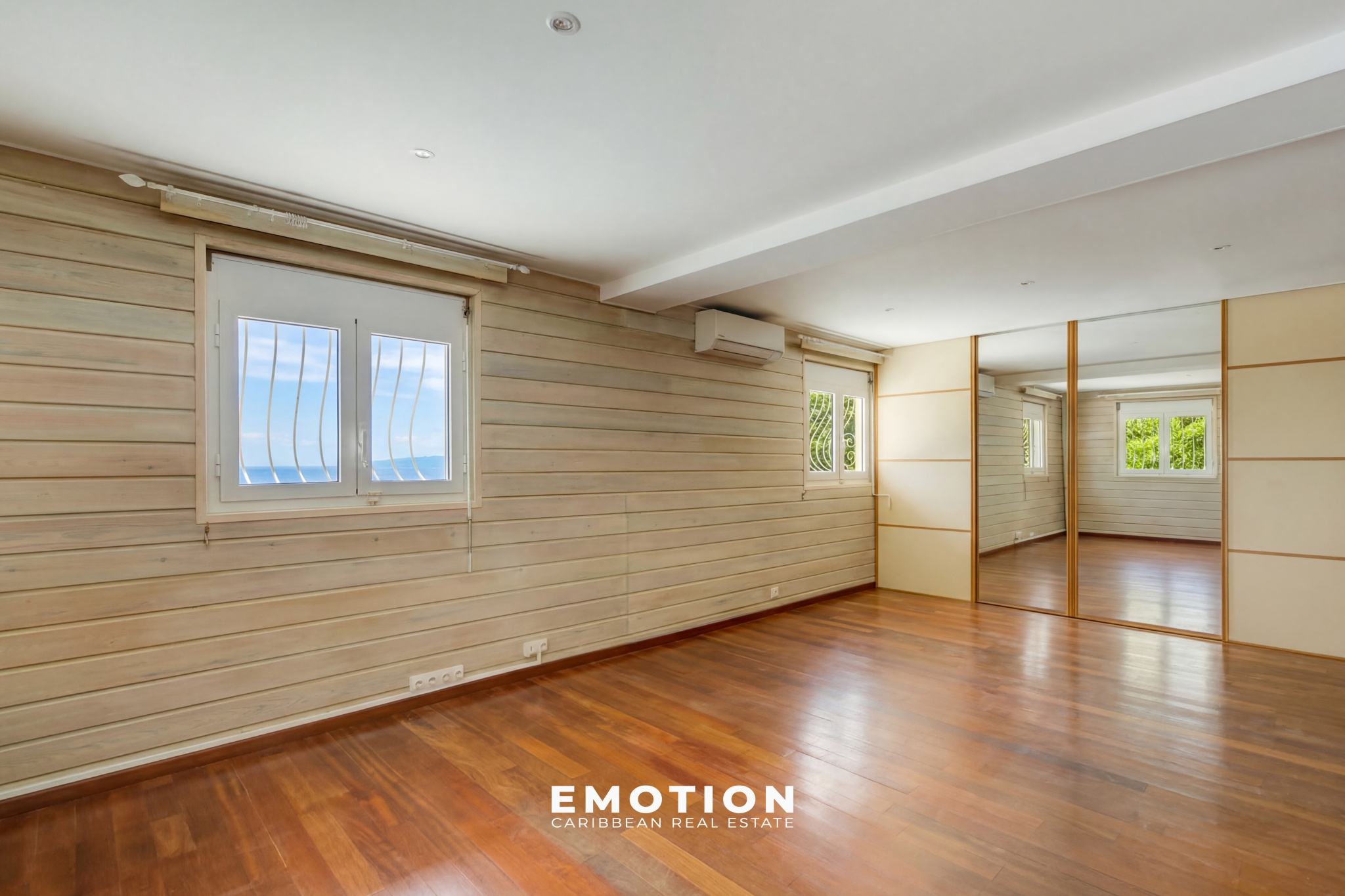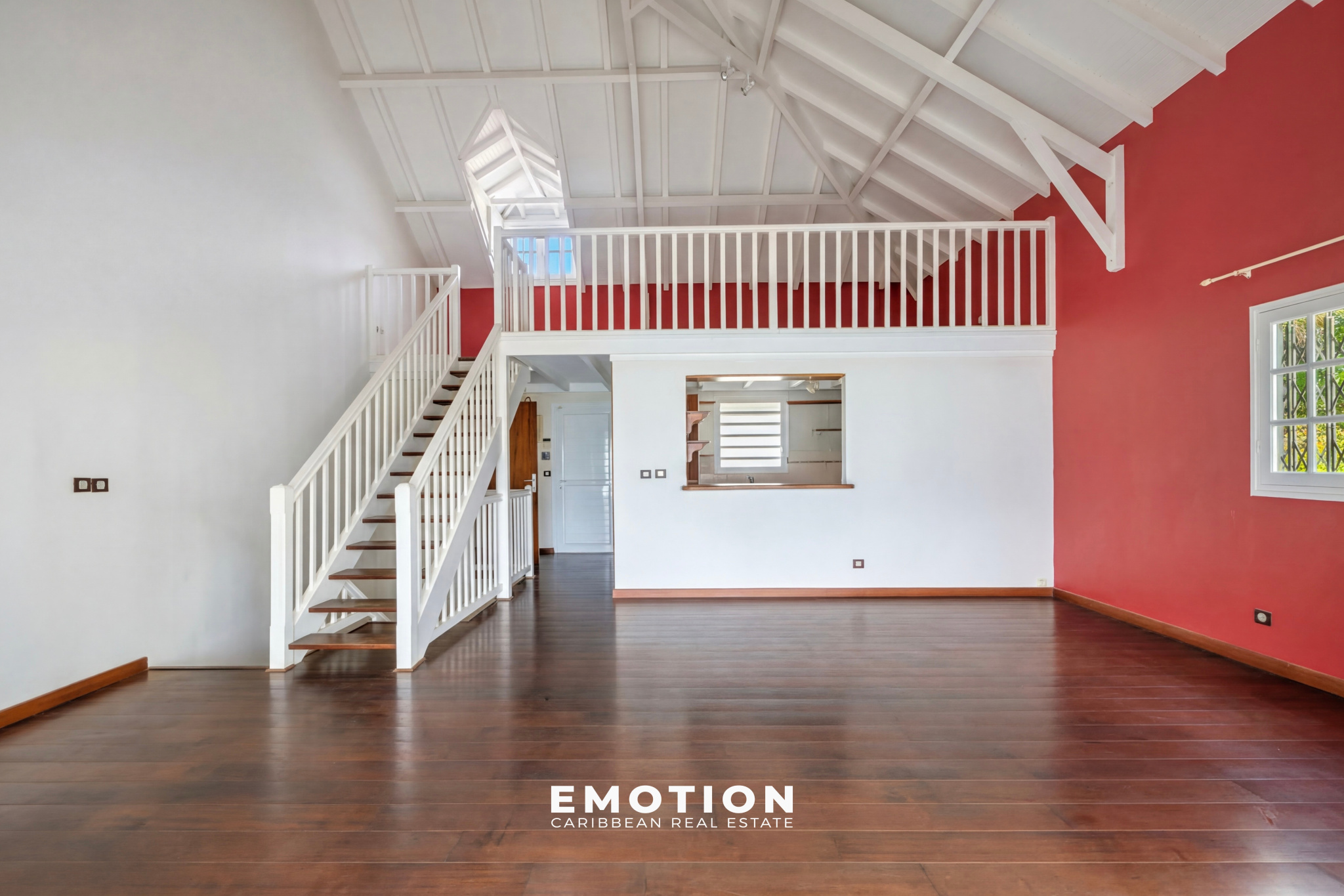 Le bien se compose au rez-de-chaussée: une entrée avec dégagement de 4 m², un WC invités de 2 m², une cuisine ouverte de 11 m² aménagée sur le séjour, un séjour climatisé de 28 m² avec une hauteur sous plafond d’environ 6 mètres offrant un volume remarquable, une mezzanine ouverte de 18 m², une terrasse couverte de 33 m² avec vue dégagée sur la mer, la végétation et la Basse-Terre.