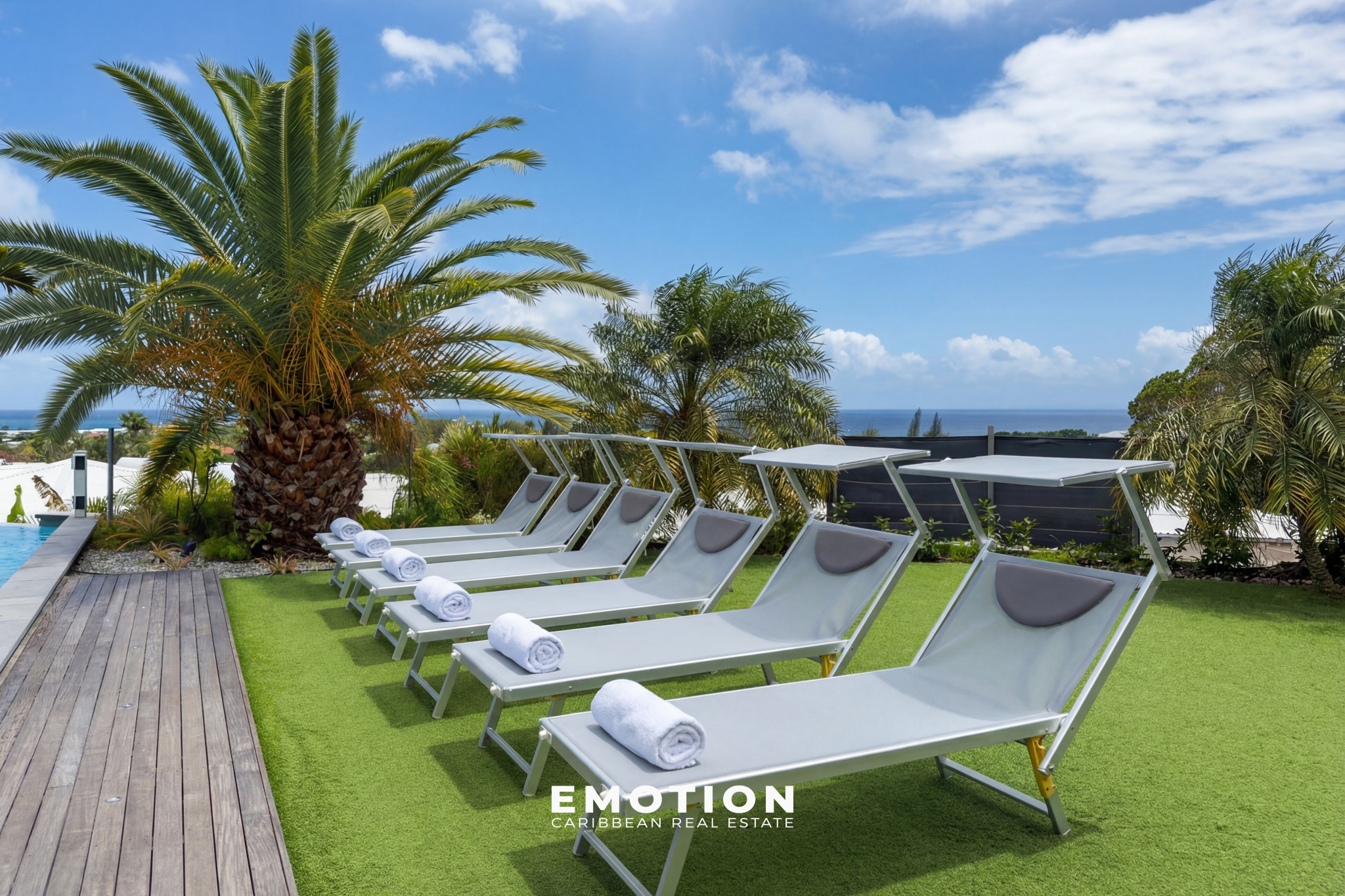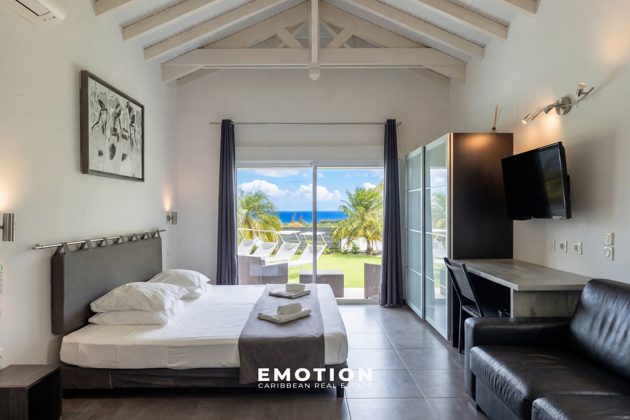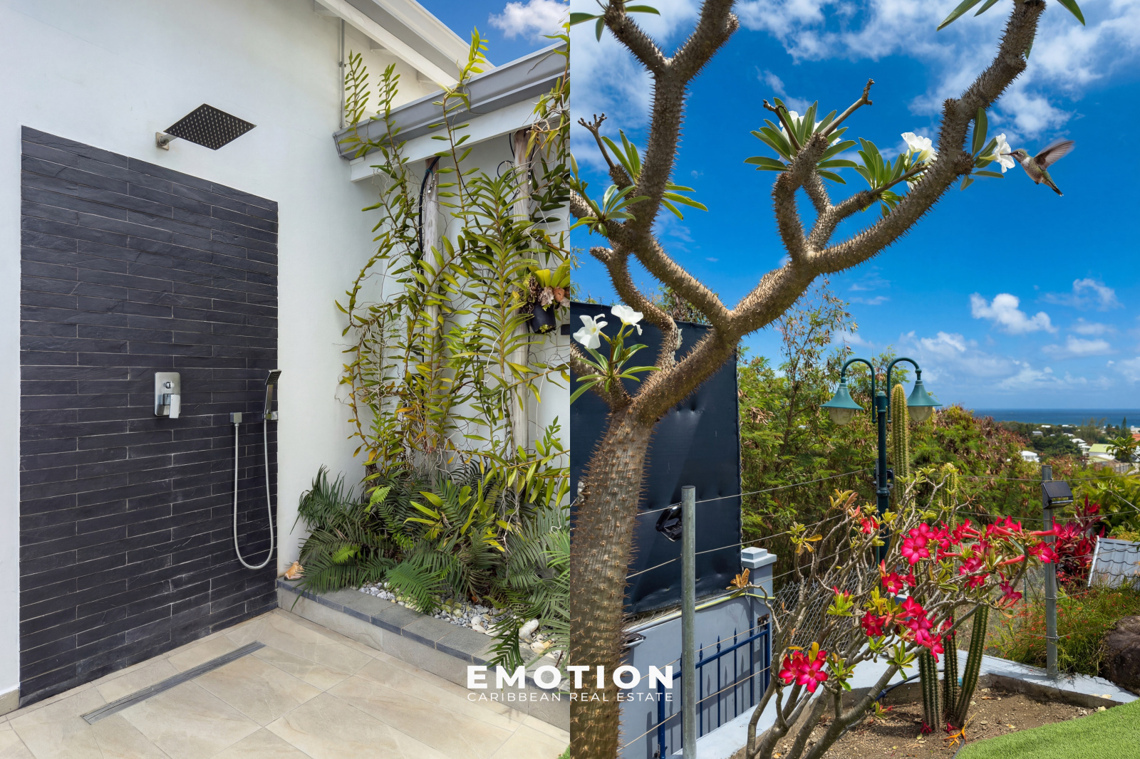 À l’extérieur, la propriété s’organise autour d’une piscine à débordement de 92 m² (15 x 5 m) avec traitement au sel, accompagnée de larges terrasses d’environ 80 m², ainsi que d’un vaste carbet aménagé en espace lounge extérieur avec vue mer panoramique. Le jardin paysager, arboré et entretenu, s’intègre parfaitement à l’ensemble et renforce le caractère intimiste des lieux. Trois douches extérieures viennent compléter les aménagements.