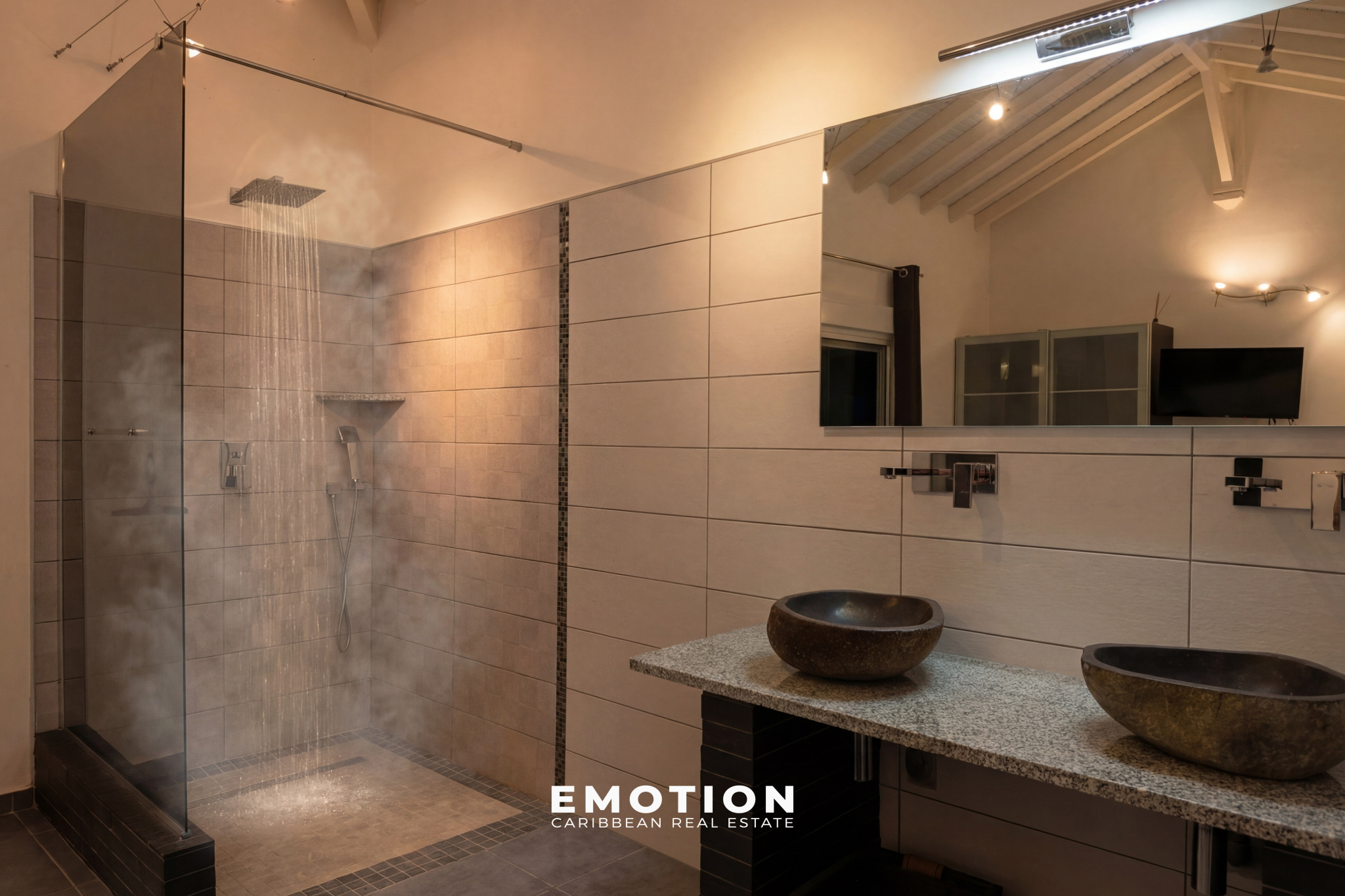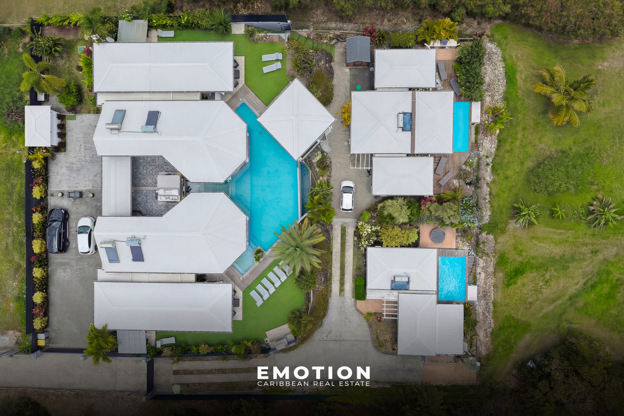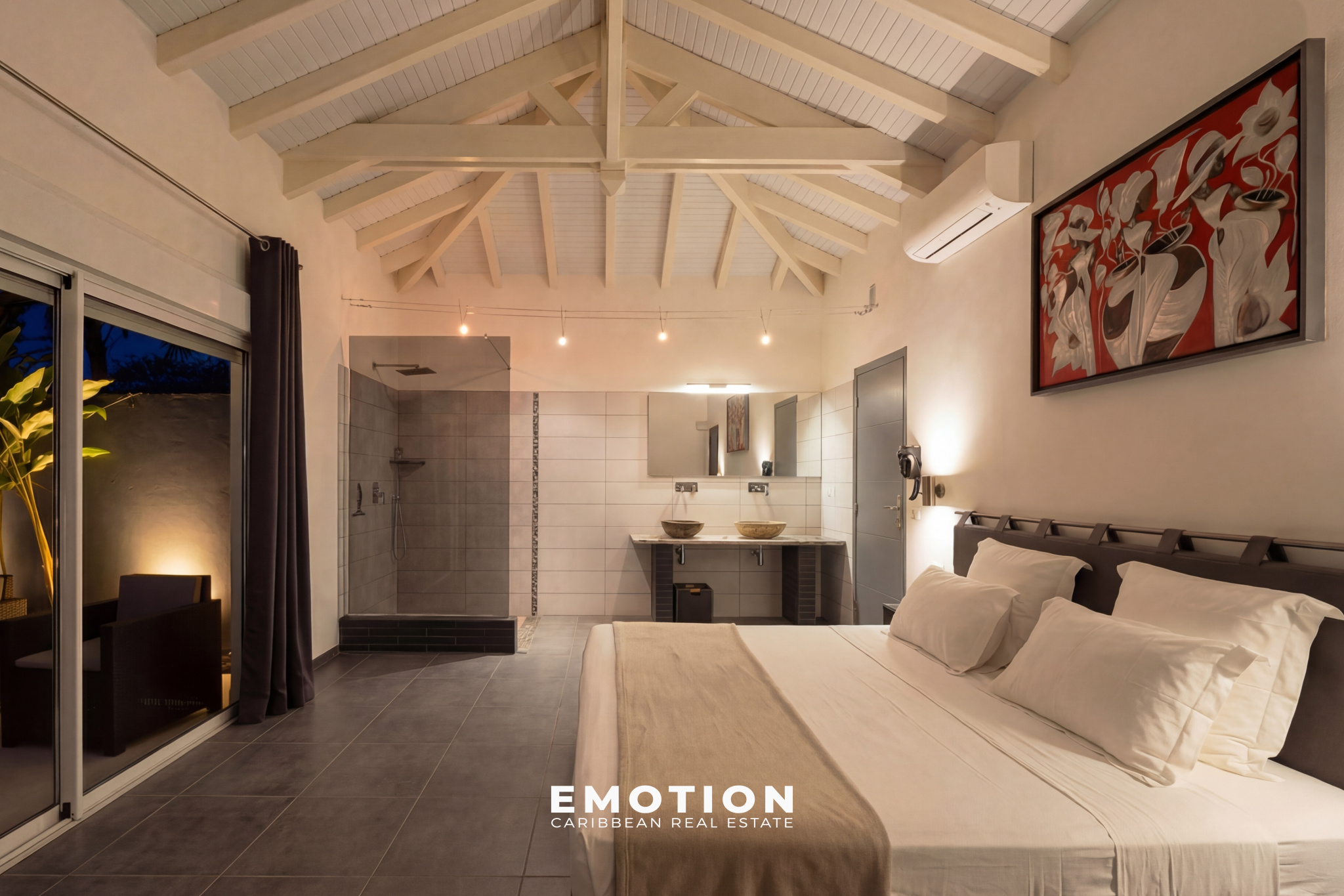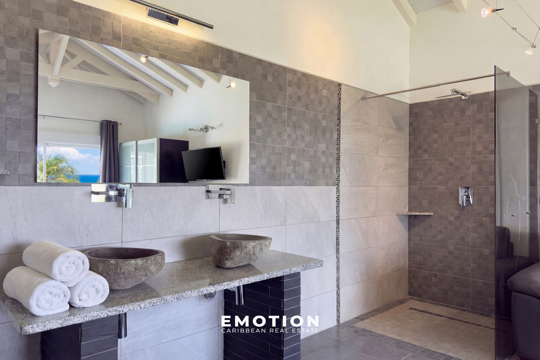 À l’extérieur, la propriété s’organise autour d’une piscine à débordement de 92 m² (15 x 5 m) avec traitement au sel, accompagnée de larges terrasses d’environ 80 m², ainsi que d’un vaste carbet aménagé en espace lounge extérieur avec vue mer panoramique. Le jardin paysager, arboré et entretenu, s’intègre parfaitement à l’ensemble et renforce le caractère intimiste des lieux. Trois douches extérieures viennent compléter les aménagements.