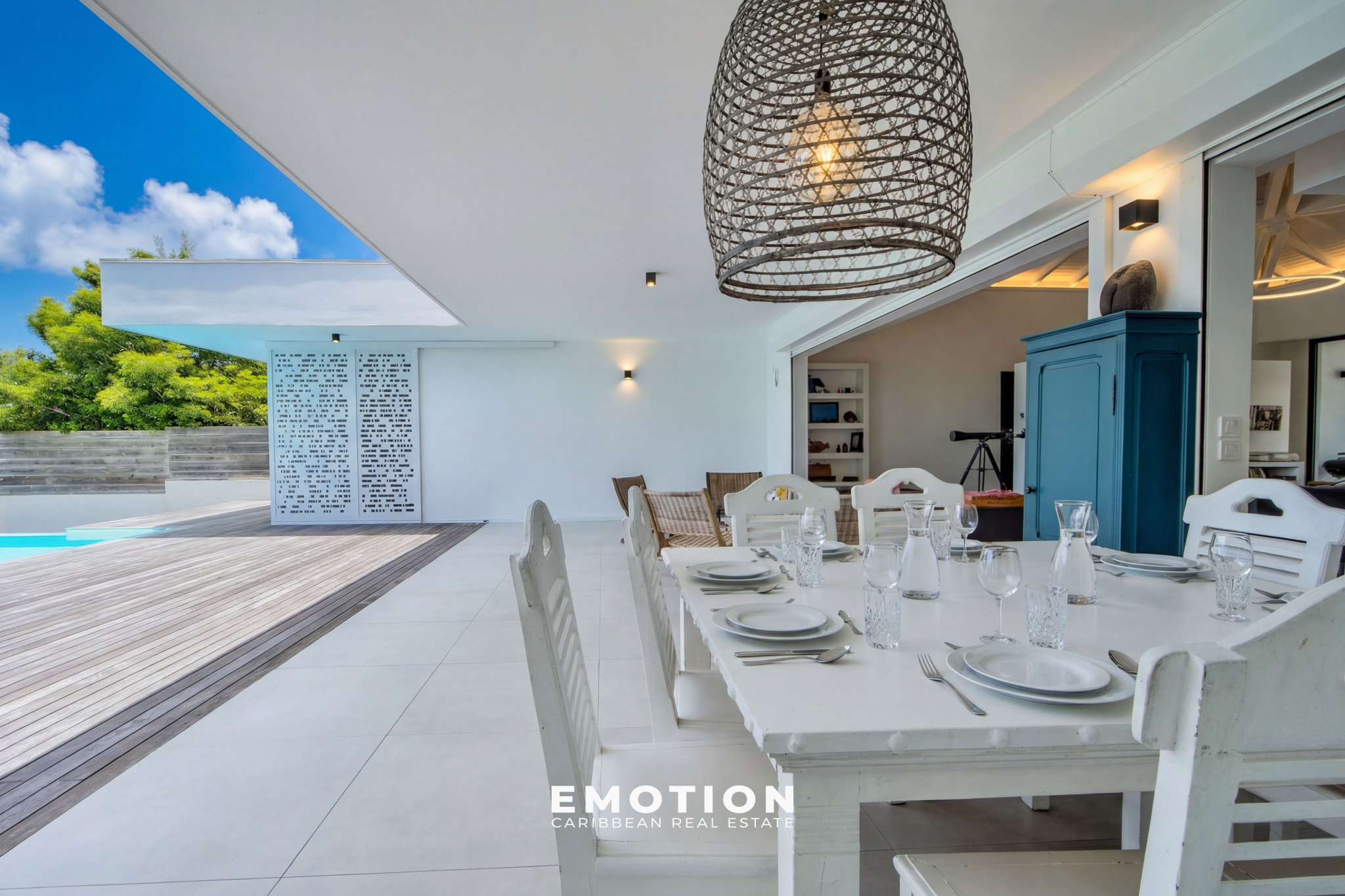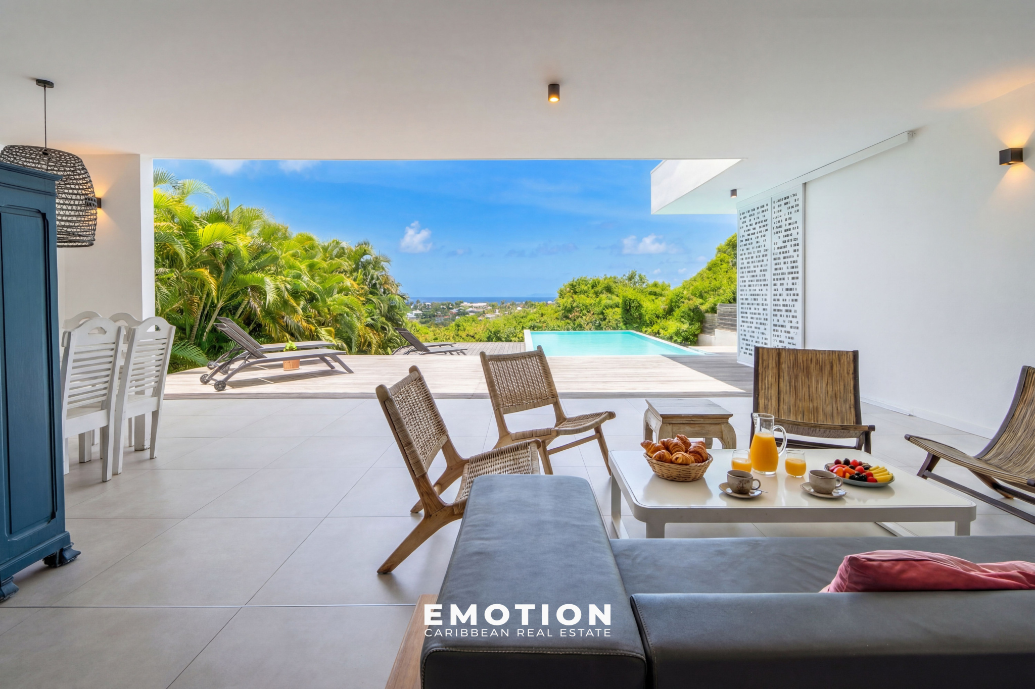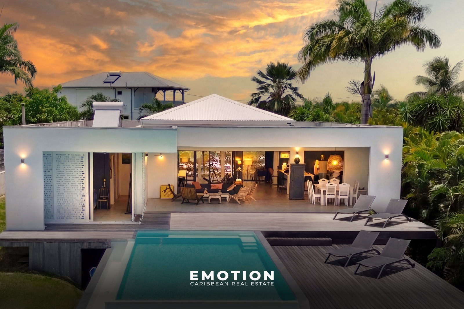 La villa récente construite en béton banché possède une architecture très moderne tout en gardant une atmosphère créole. Une conception qui privilégie les détails et des grands espaces ouverts. Des moucharabiés coulissant permettent une occultation douce tout en filtrant la lumière.
