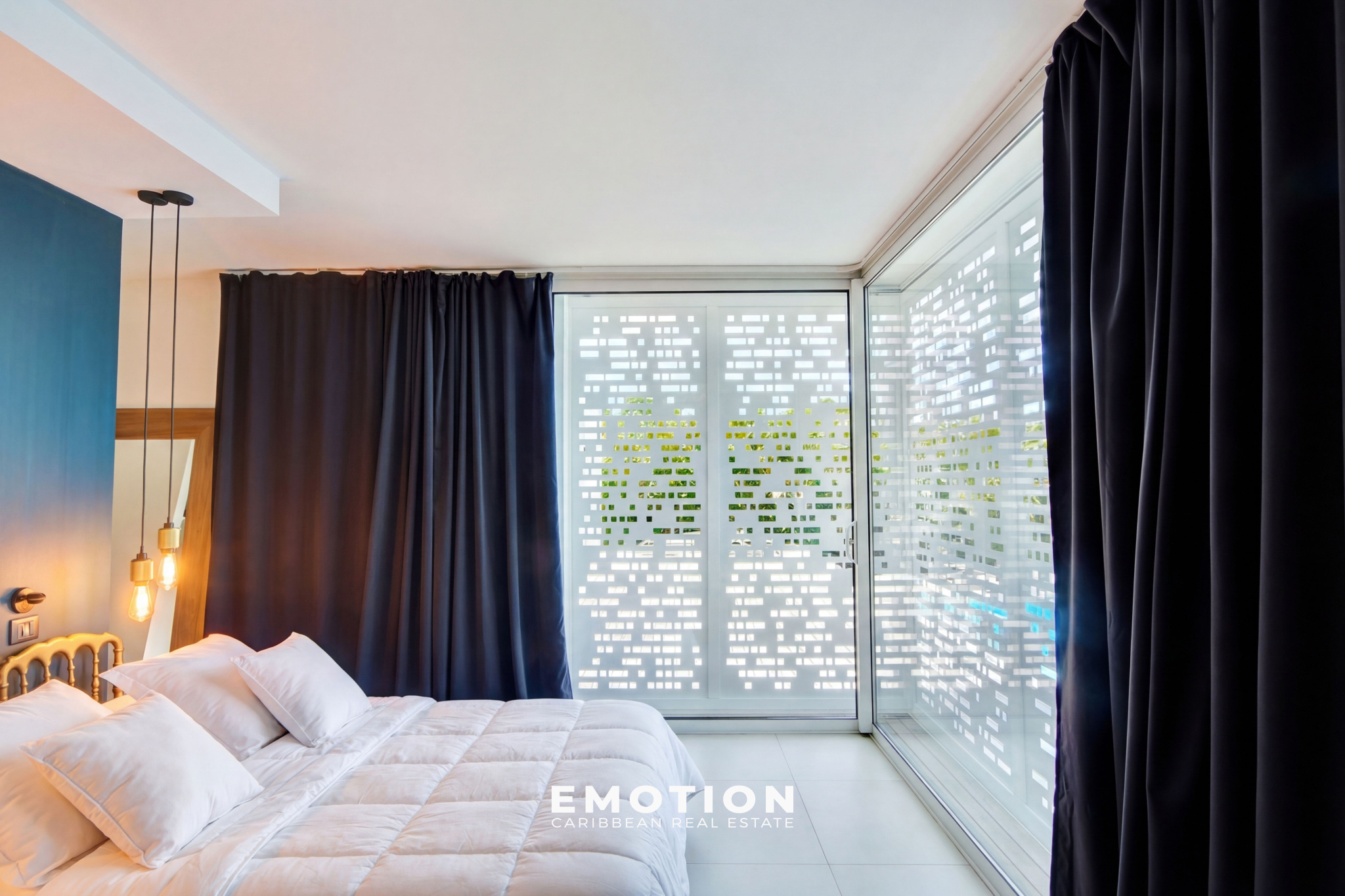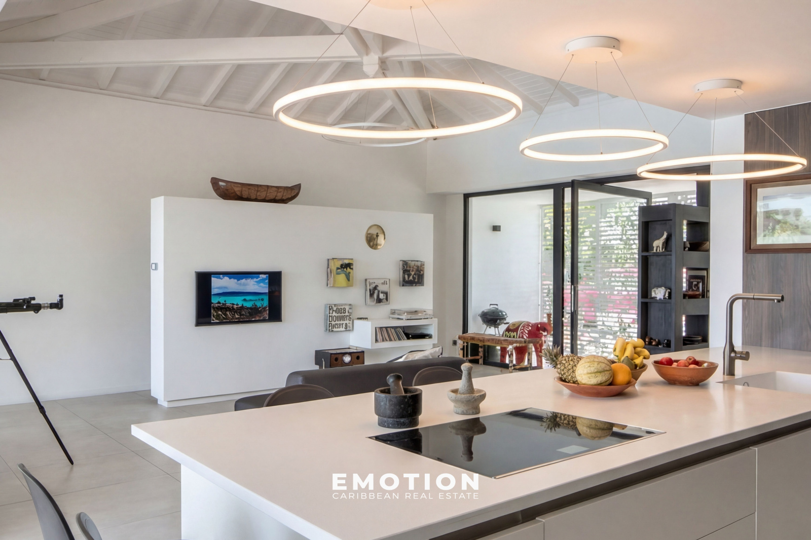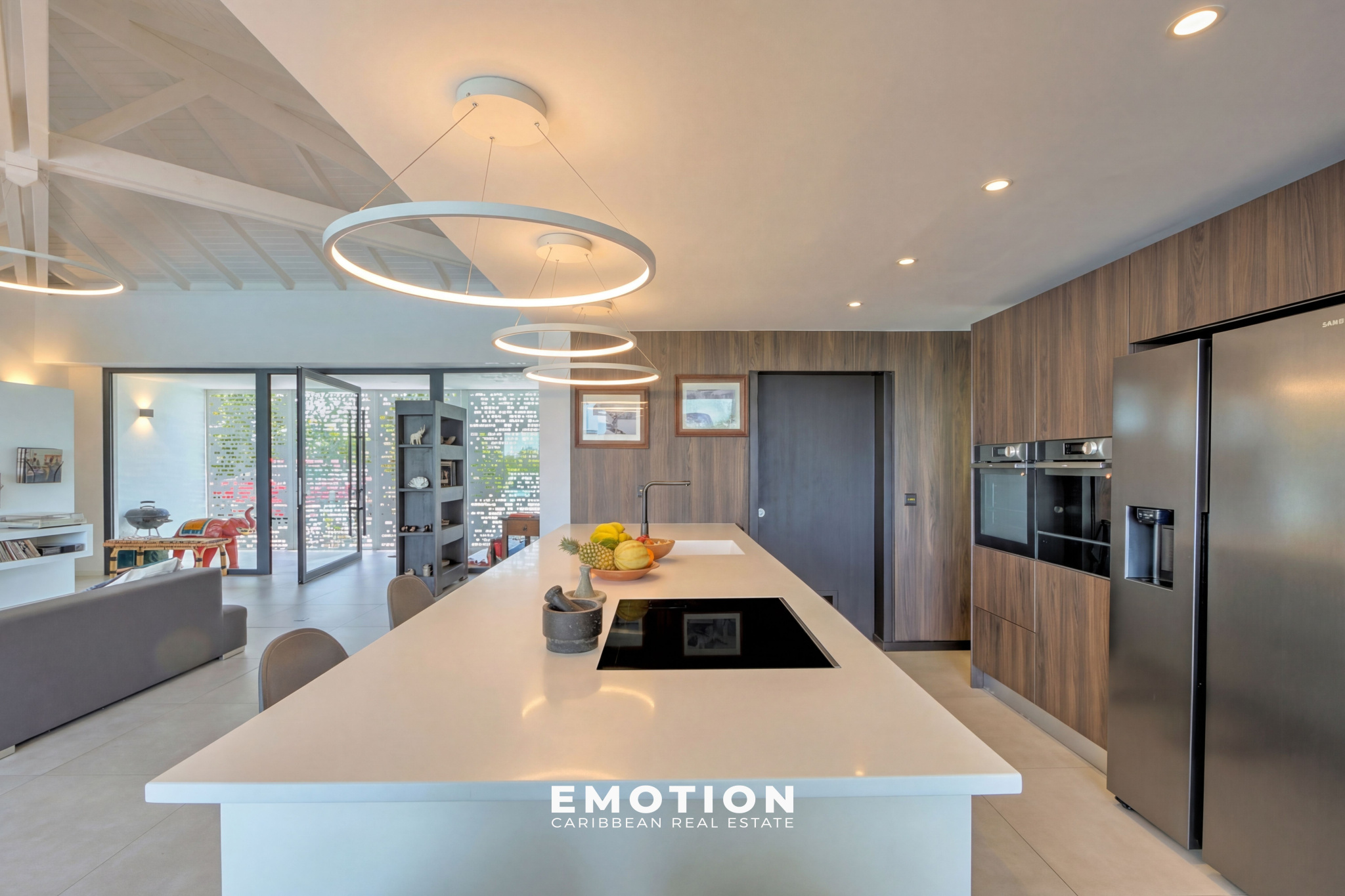 La villa récente construite en béton banché possède une architecture très moderne tout en gardant une atmosphère créole. Une conception qui privilégie les détails et des grands espaces ouverts. Des moucharabiés coulissant permettent une occultation douce tout en filtrant la lumière.