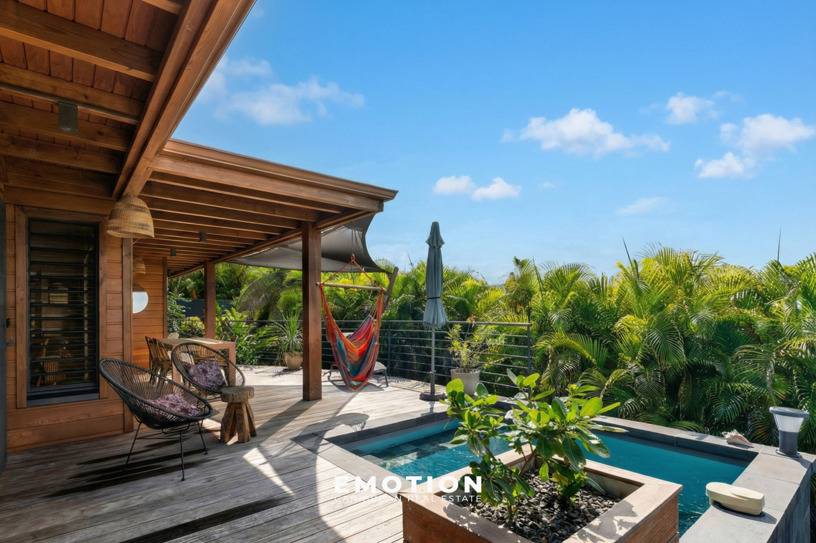 Le salon et les chambres s'ouvrent sur la terrasse ombragée de 40 m² et une piscine type "bac à punch".